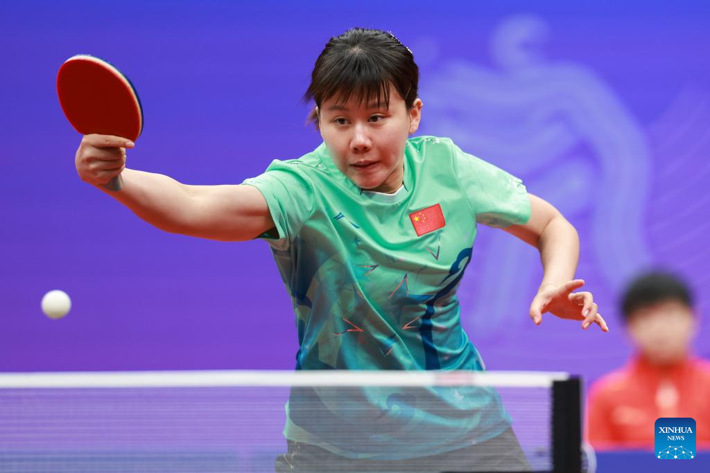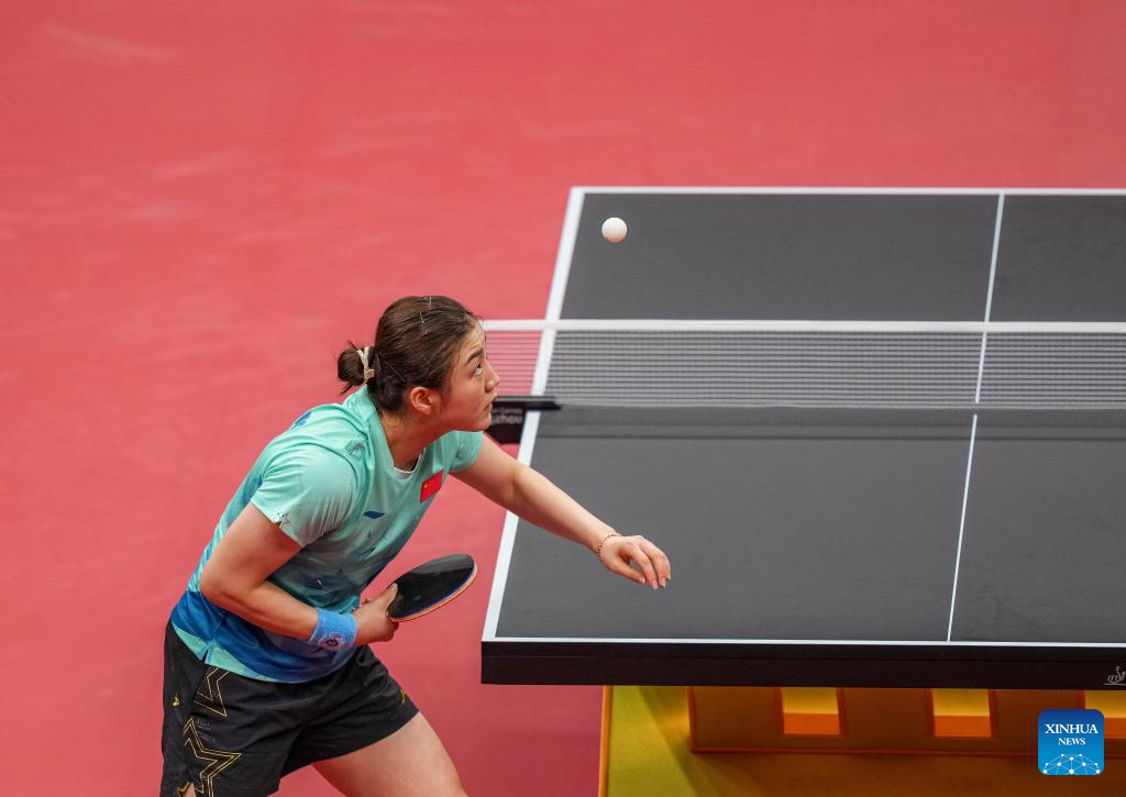 Wang Manyu of China competes against Cheong Chi Hun of China's Macao during the women's team preliminary group A match between China and China's Macao at the 19th Asian Games in Hangzhou, east China's Zhejiang Province, Sept. 22, 2023. (Xinhua/Liu Xu)
