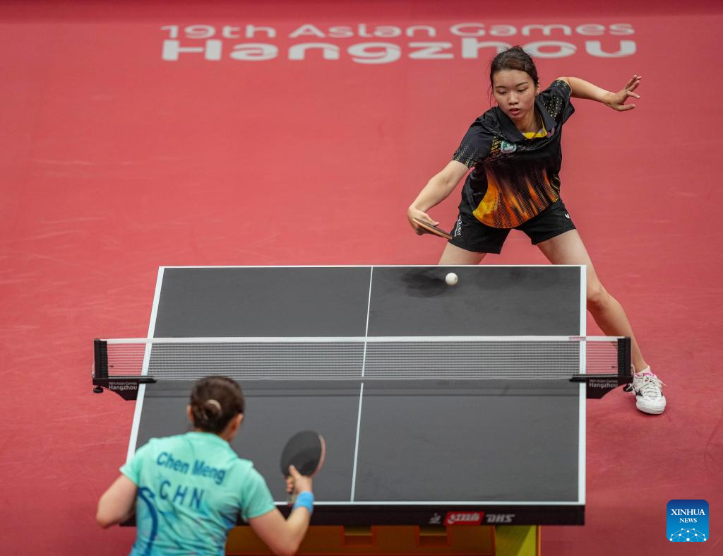 Seak Hui Li of China's Macao competes against Chen Meng of China during the women's team preliminary group A match between China and China's Macao at the 19th Asian Games in Hangzhou, east China's Zhejiang Province, Sept. 22, 2023. (Xinhua/Liu Xu)