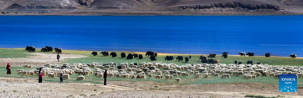 This aerial photo taken on Sept. 21, 2023 shows herders grazing their livestock by the Banggong Co in Rutog County of Ngari Prefecture of southwest China's Tibet Autonomous Region. (Xinhua/Jiang Fan)