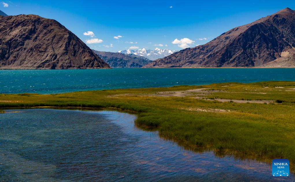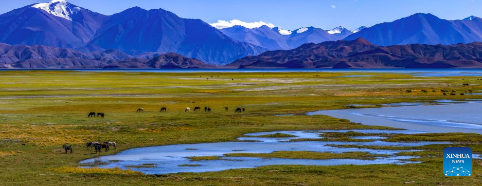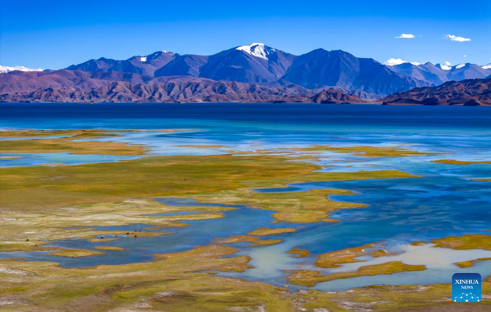 This aerial photo taken on Sept. 21, 2023 shows wetlands by the Banggong Co in Rutog County of Ngari Prefecture of southwest China's Tibet Autonomous Region. (Xinhua/Jiang Fan)