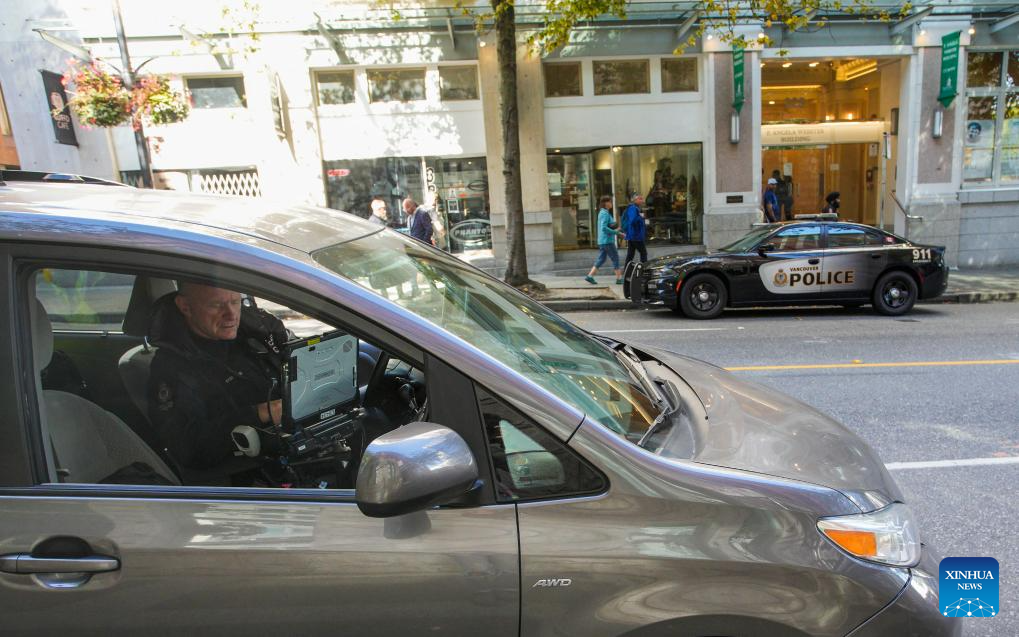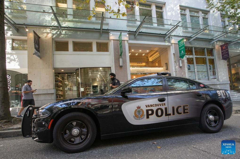 A Vancouver police vehicle is parked outside the building where the office of the Consulate General of India is located in Vancouver, Canada, on Sept. 21, 2023. The Vancouver Police Department is beefing up security outside the office of the Consulate General of India. Canada has expelled a top Indian diplomat for his alleged involvement in the assassination of Canadian Sikh leader Hardeep Singh Nijjar in the Canadian province of British Columbia in June, Foreign Minister Melanie Joly said Monday. (Photo by Liang Sen/Xinhua)