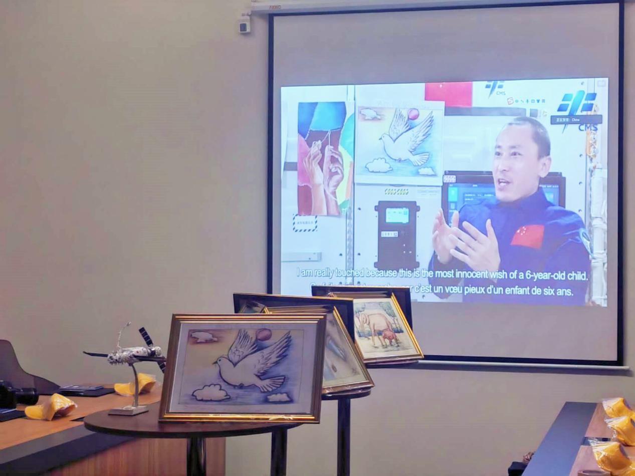 Zhu Yangzhu, a Chinese astronaut on the Shenzhou-16 mission, introduces award-winning paintings of the "My Dream" painting competition for African youth via video link. (Photo courtesy of the Chinese Embassy in Somalia)