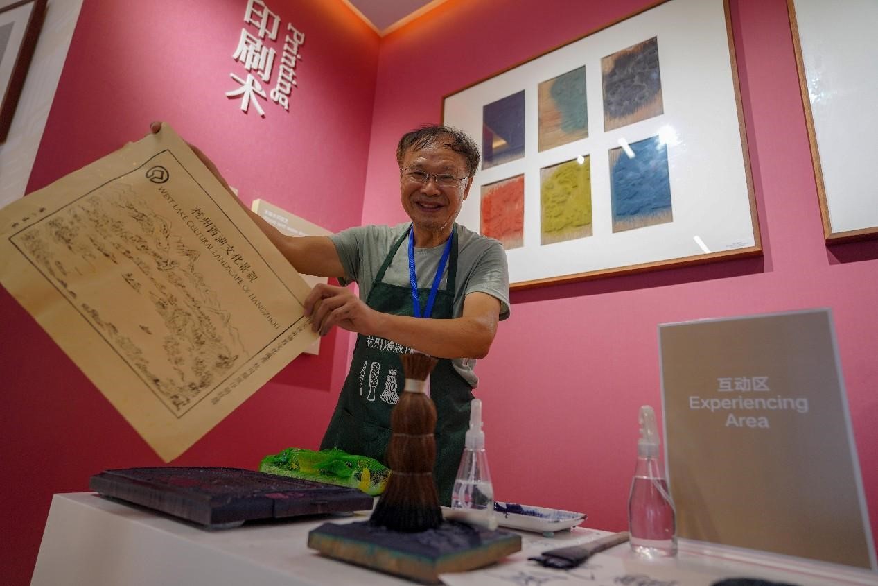 An inheritor of intangible cultural heritage showcases woodblock printing in the Hangzhou Asian Games Village. (People's Daily Online/Zhang Yongtao)