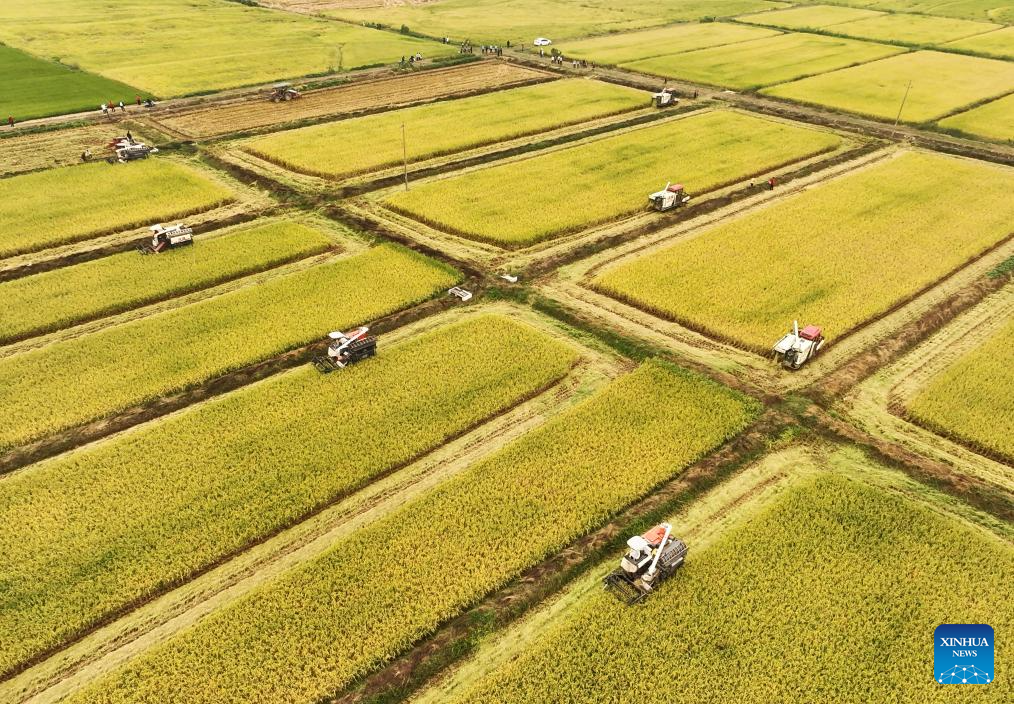 This aerial photo taken on Sept. 23, 2023 shows farmers harvesting rice in paddy fields of Kuzongqiao Township, Hengyang City, central China's Hunan Province.