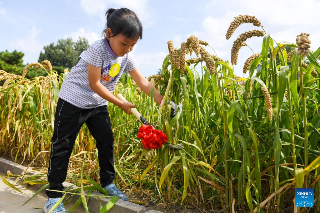 A child learns to use a sickle to harvest rice in a paddy field in Beijing, capital of China, Sept. 23, 2023.