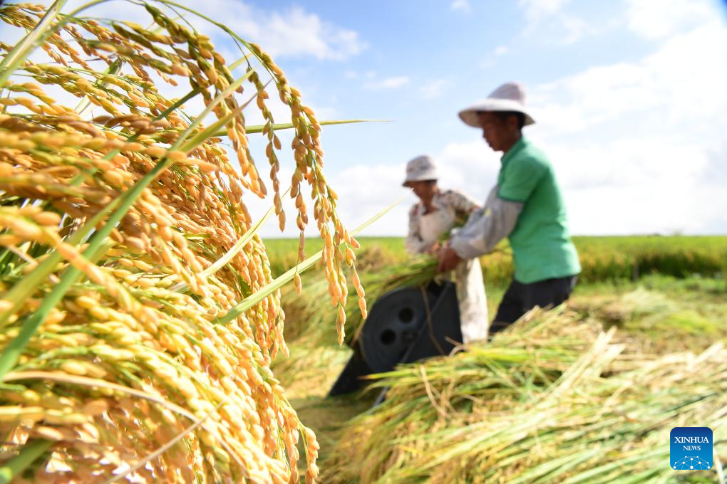 Farmers harvest rice in a paddy field in Luoping County of Qujing City, southwest China's Yunnan Province, Sept. 23, 2023.