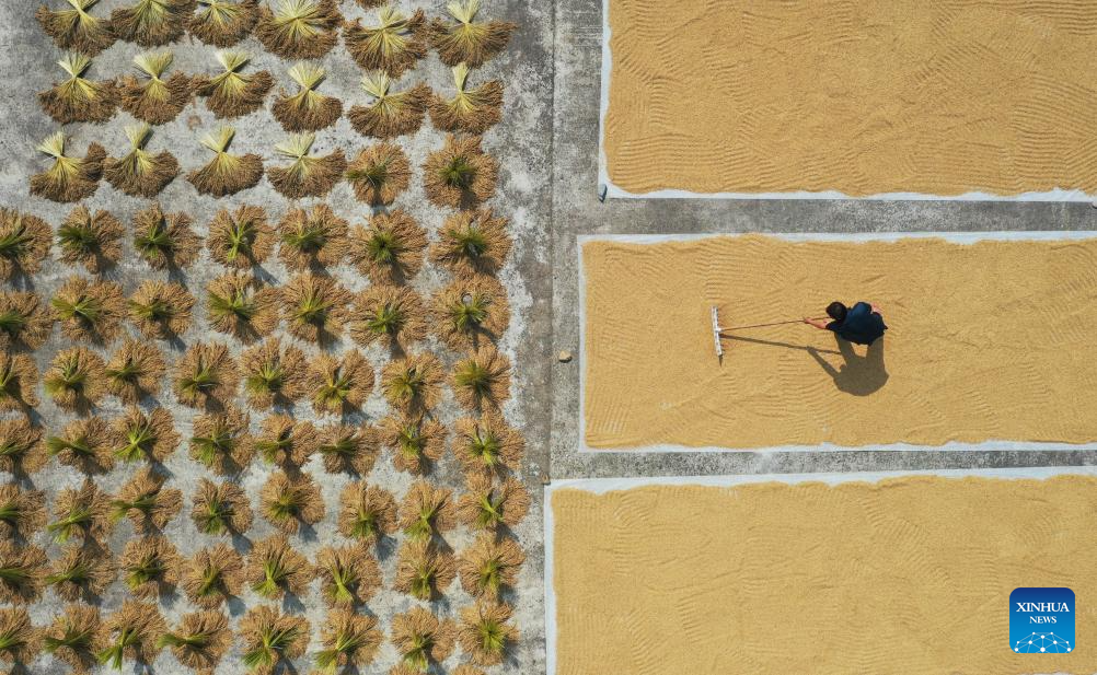 This aerial photo taken on Sept. 23, 2023 shows a farmer drying grains in Congjiang County of Qiandongnan Miao and Dong Autonomous Prefecture, southwest China's Guizhou Province.