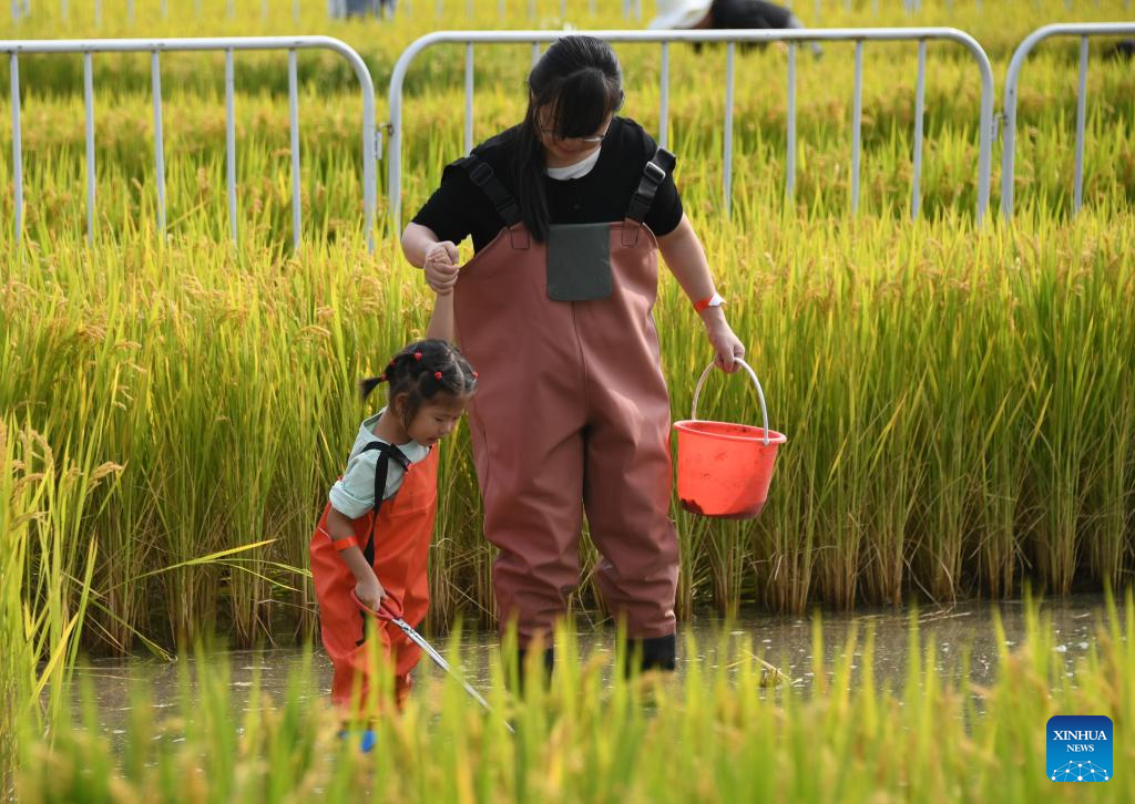 Citizens catch crabs in a paddy field in Haidian District of Beijing, capital of China, Sept. 23, 2023.