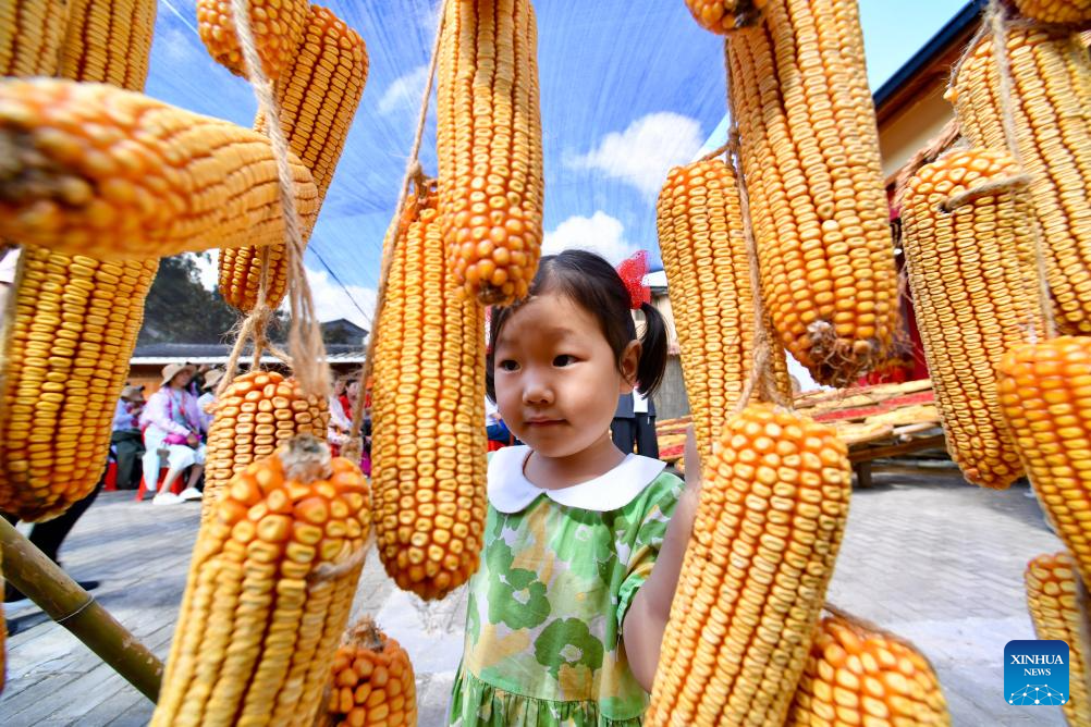 A child looks at corns being dried under the sun at Guifeng Village of Youxi County, southeast China's Fujian Province, Sept. 23, 2023.