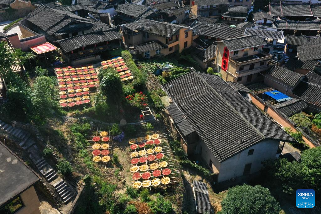 This aerial photo taken on Sept. 23, 2023 shows hot peppers and corns being dried under the sun at Guifeng Village of Youxi County, southeast China's Fujian Province.