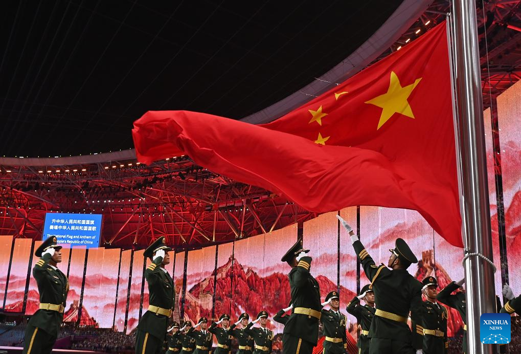 The Chinese national flag is raised during the opening ceremony of the 19th Asian Games in Hangzhou, east China's Zhejiang Province, Sept. 23, 2023. (Xinhua/Jia Haocheng)