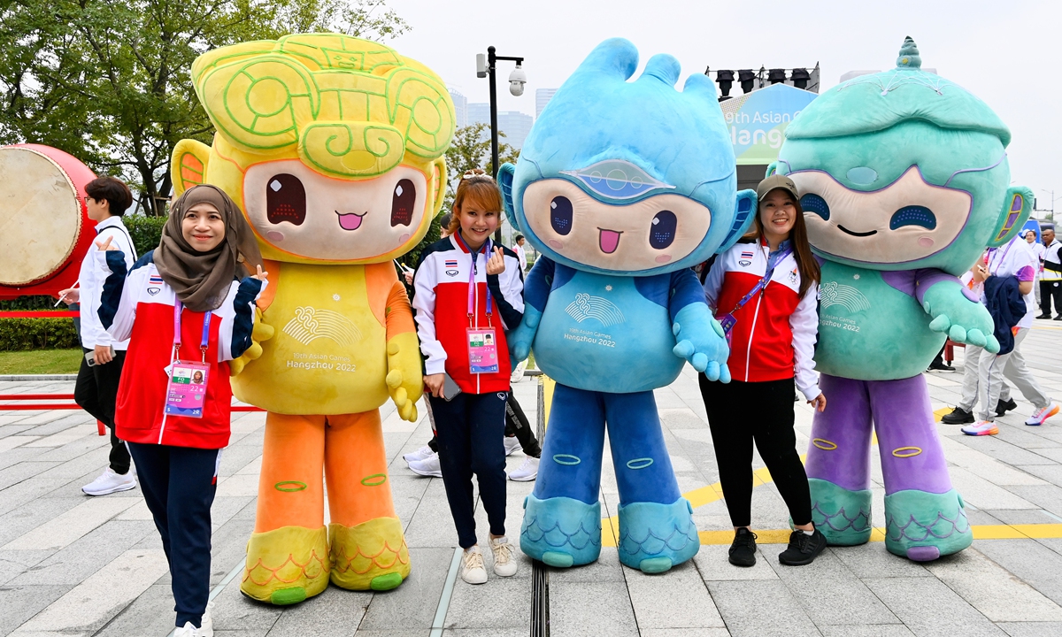 Members of the Thai delegation pose with the Hangzhou Asian Games mascot dolls at the Asian Games Athletes' Village on September 22, 2023 in Hangzhou, East China's Zhejiang Province. On the day, the organizers held a welcome ceremony for the athletes at the Athletes' Village. Photo: cnsphoto