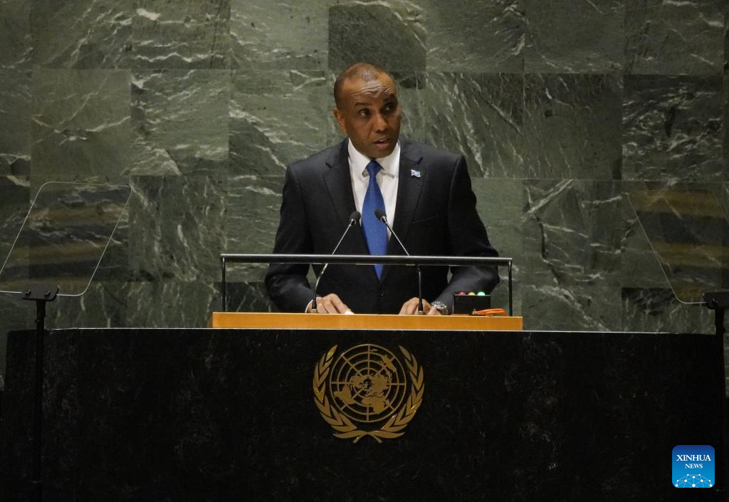 Hamza Abdi Barre, prime minister of Somalia, delivers a speech at the General Debate of the 78th session of the UN General Assembly at the UN headquarters in New York, Sept. 23, 2023. (Xinhua/Wu Xiaoling)