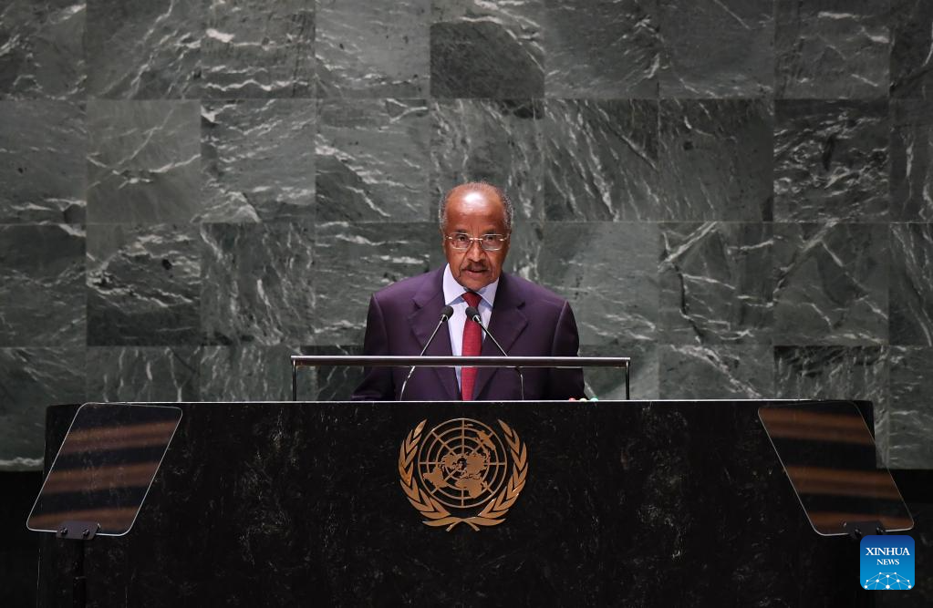 Osman Saleh Mohammed, Eritrea's Foreign Affairs Minister, delivers a speech at the General Debate of the 78th session of the UN General Assembly at the UN headquarters in New York, Sept. 23, 2023. (Xinhua/Li Rui)