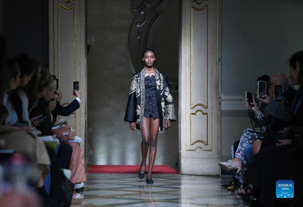 A model presents a creation featuring embroidery of Miao ethnic group from southwest China's Guizhou Province during Milan Fashion Week in Milan, Italy, Sept. 24, 2023. (Xinhua/Jin Mamengni)