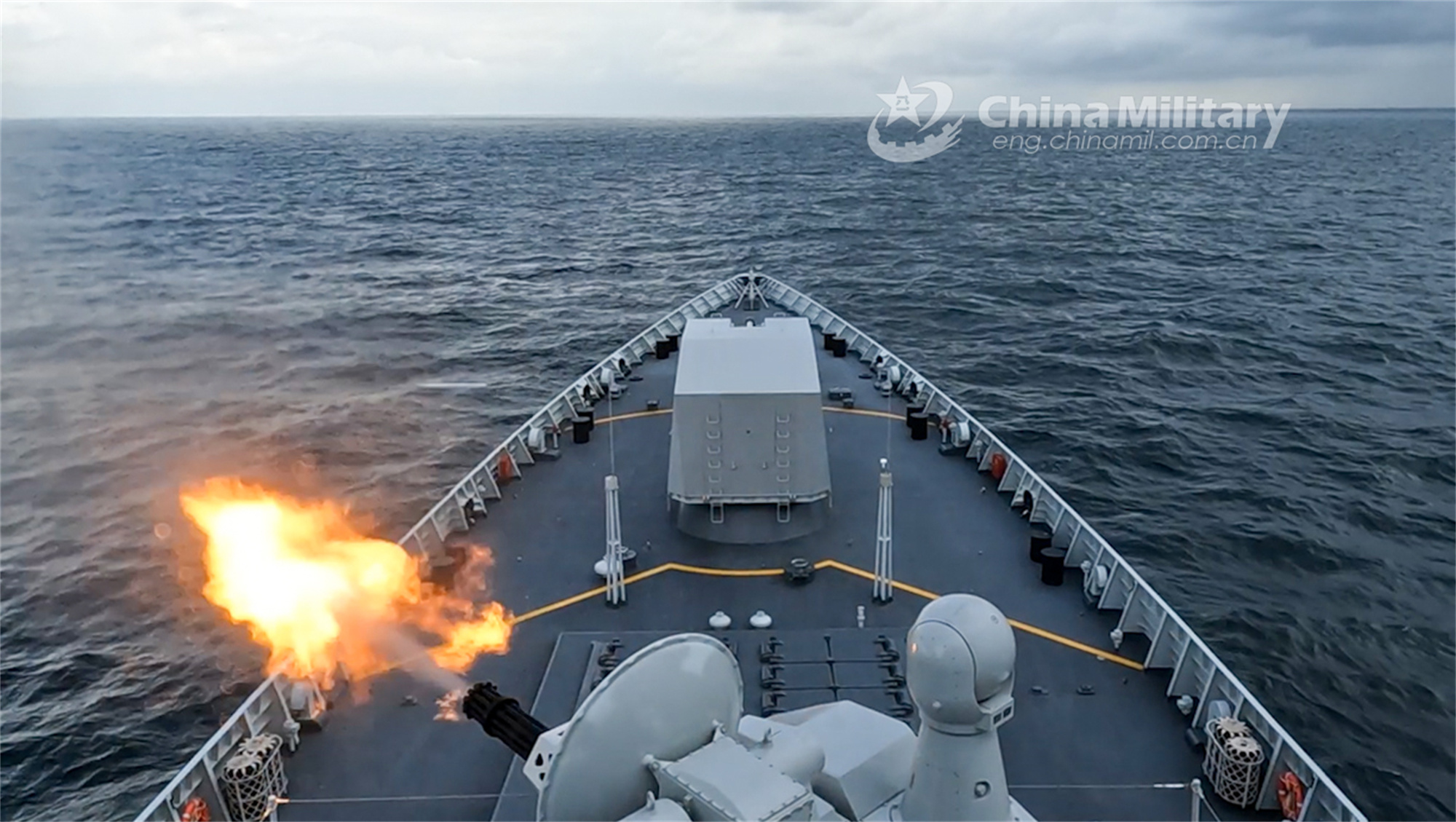 The guided-missile destroyer Shaoxing attached to a destroyer flotilla with the navy under the PLA Eastern Theater Command fires its close-in weapons system during a maritime training exercise on August 21,2023. (eng.chinamil.com.cn/Photo by Wen Zidong)