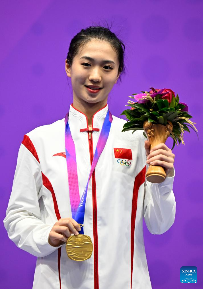 Tong Xin of China attends the awarding ceremony for Women's Taijiquan & Taijijian All-round of Wushu at the 19th Asian Games in Hangzhou, east China's Zhejiang Province, Sept. 24, 2023. (Xinhua/Song Yanhua)