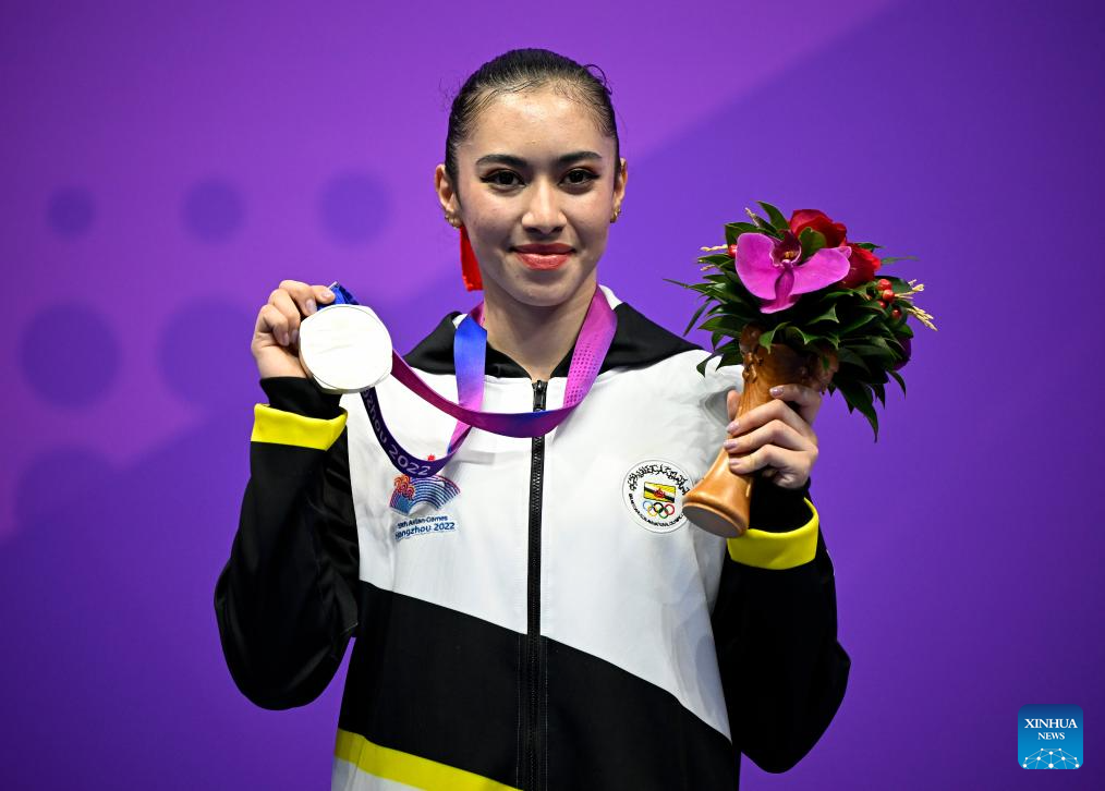 Silver medalist Basma Lachkar of Brunei Darussalam attends the awarding ceremony for Women's Taijiquan & Taijijian All-round of Wushu at the 19th Asian Games in Hangzhou, east China's Zhejiang Province, Sept. 24, 2023. (Xinhua/Song Yanhua)