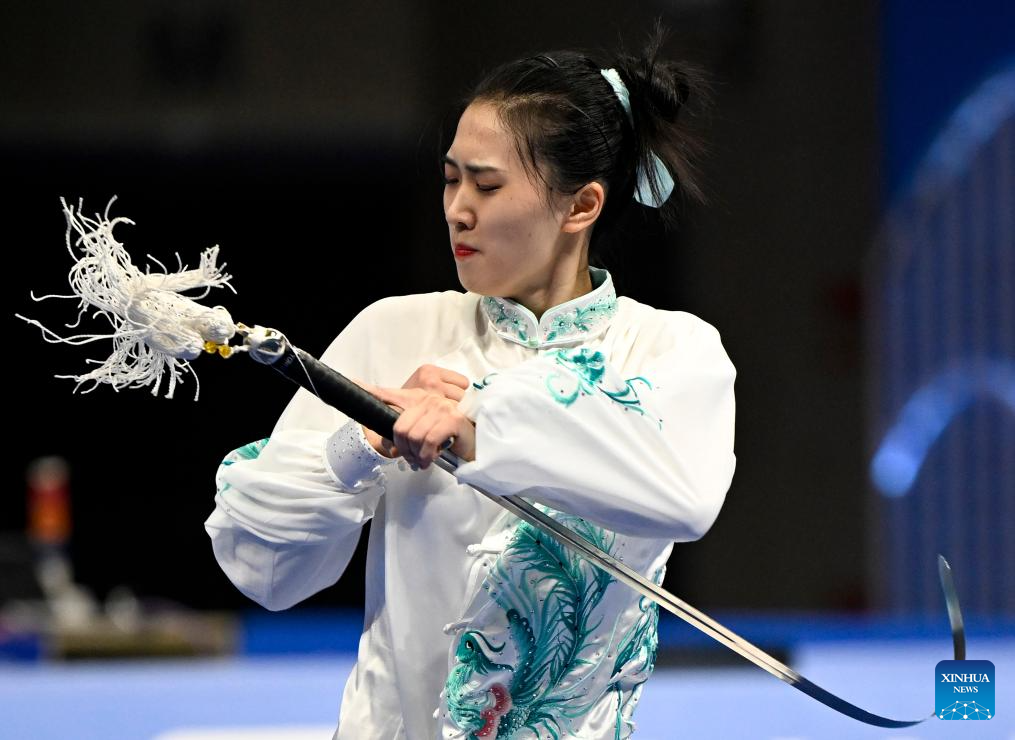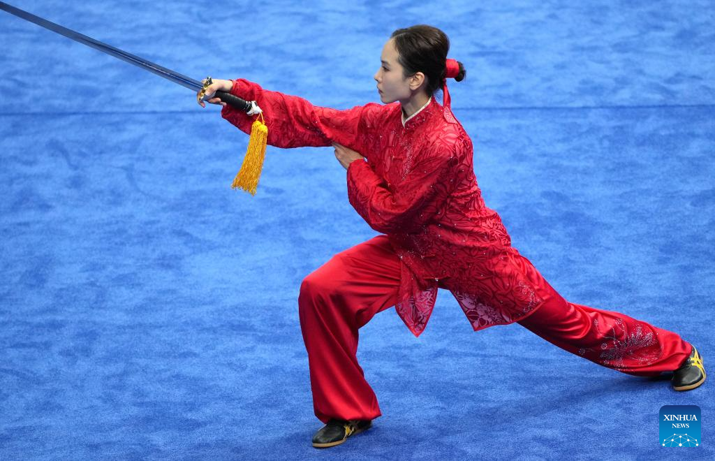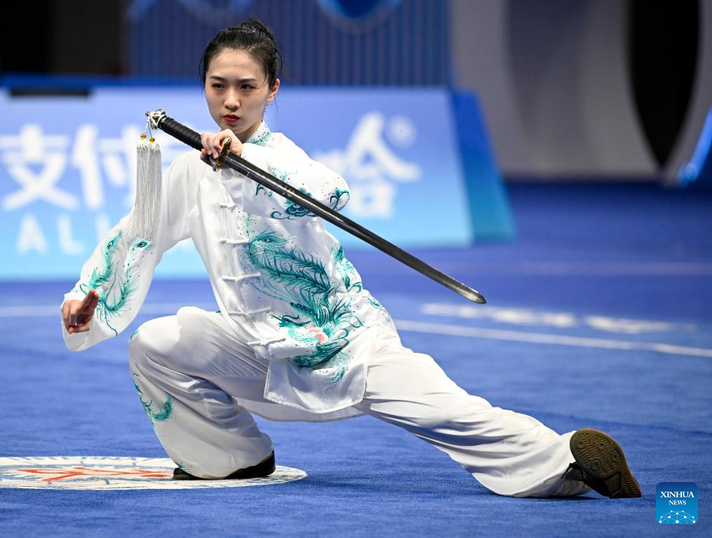 Chen Suijin of China's Hong Kong competes during Women's Taijijian Final of Wushu at the 19th Asian Games in Hangzhou, east China's Zhejiang Province, Sept. 24, 2023. Women's Taijiquan & Taijijian All-round of Wushu took place here Sunday. (Xinhua/Li Yibo)