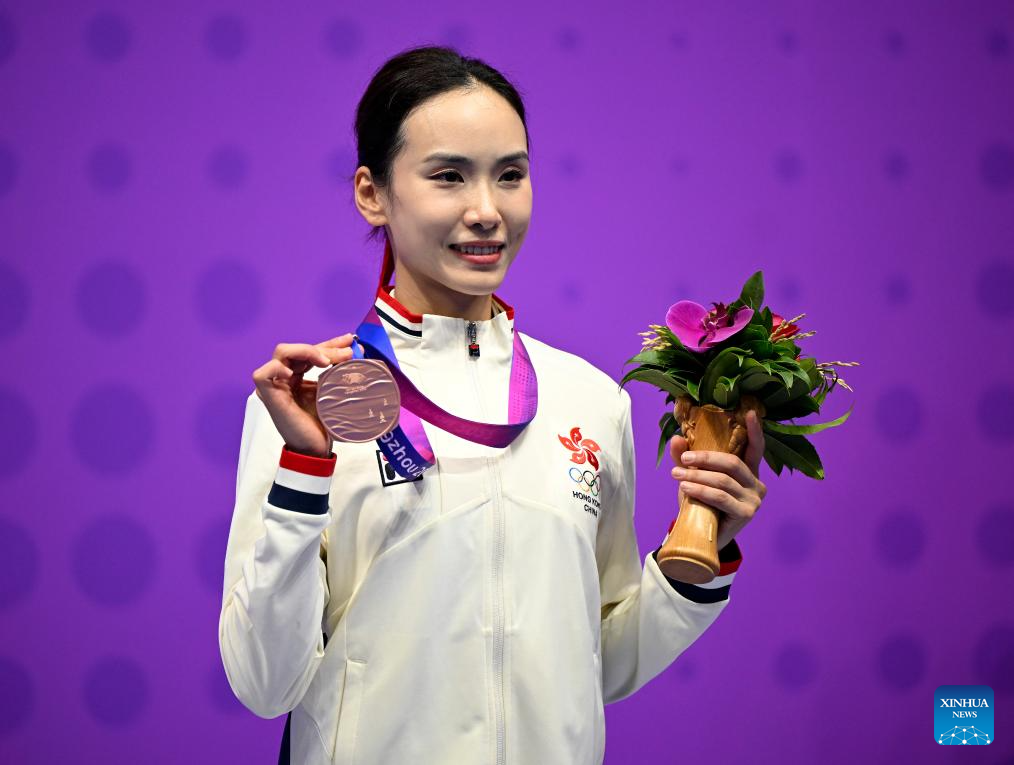 Bronze medalist Chen Suijin of China's Hong Kong attends the awarding ceremony for Women's Taijiquan & Taijijian All-round of Wushu at the 19th Asian Games in Hangzhou, east China's Zhejiang Province, Sept. 24, 2023. (Xinhua/Song Yanhua)