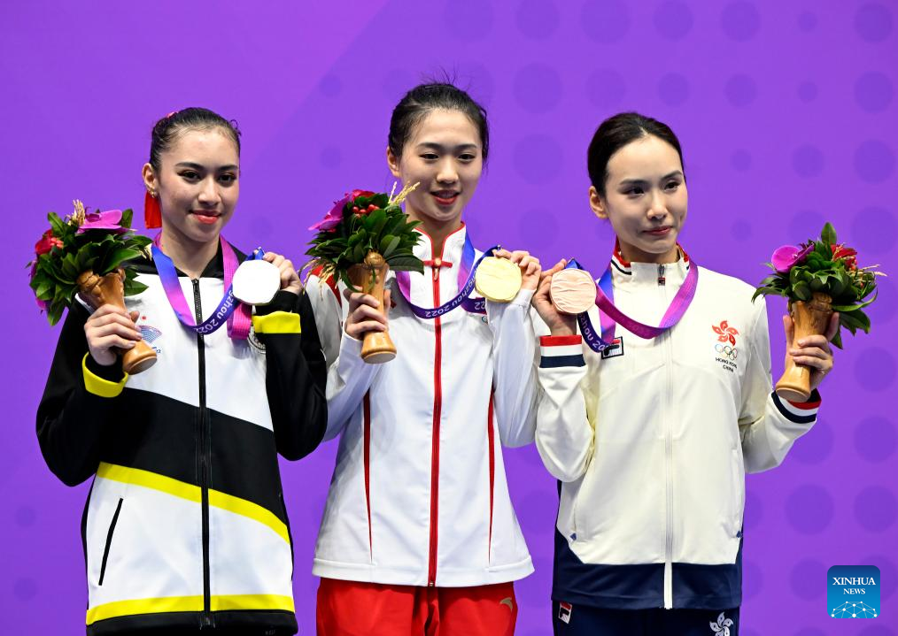 Gold medalist Tong Xin of China (C), silver medalist Basma Lachkar of Brunei Darussalam (L) and bronze medalist Chen Suijin of China's Hong Kong attend the awarding ceremony for Women's Taijiquan & Taijijian All-round of Wushu at the 19th Asian Games in Hangzhou, east China's Zhejiang Province, Sept. 24, 2023. (Xinhua/Song Yanhua)