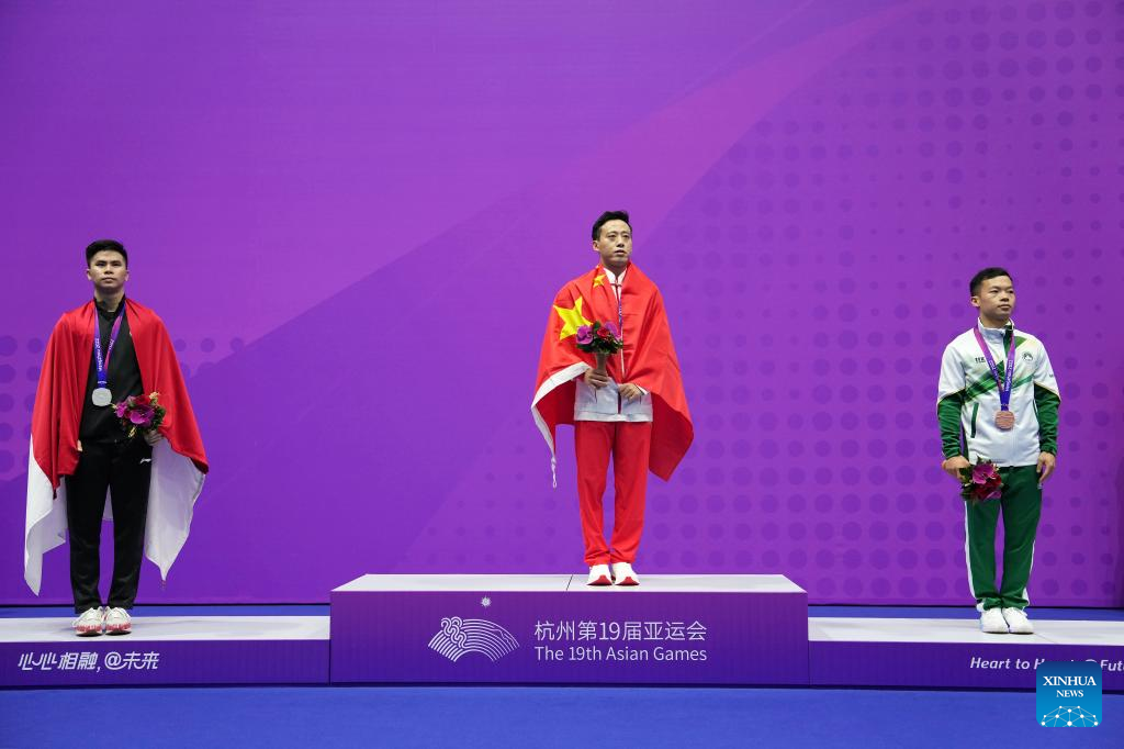 Silver medalist Edgar Xavier Marvelo of Indonesia, gold medalist Sun Peiyuan of China and bronze medalist Song Chi Kuan of China's Macao (L-R) are seen at the awarding ceremony of men's changquan of wushu at the 19th Asian Games in Hangzhou, east China's Zhejiang Province, Sept. 24, 2023. (Xinhua/Li Yibo)