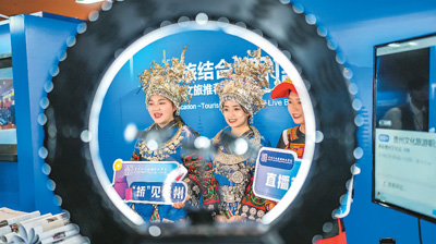 Students of Guizhou Vocational College of Culture and Tourism host a livestream during the 2023 China-ASEAN Education Cooperation Week. (Xinhua/Tao Liang)