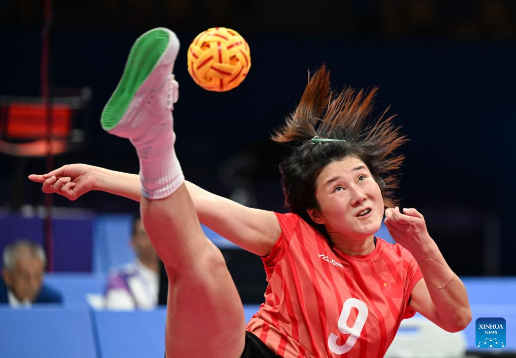 Lao Tianxue of Team China competes during Women's Team Regu Preliminary Match of Sepaktakraw between China and South Korea at the 19th Asian Games in Jinhua, east China's Zhejiang Province, Sept. 24, 2023. (Xinhua/Chen Zhonghao)