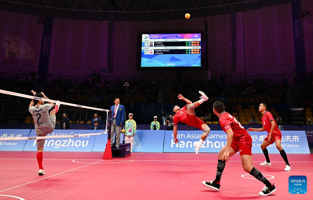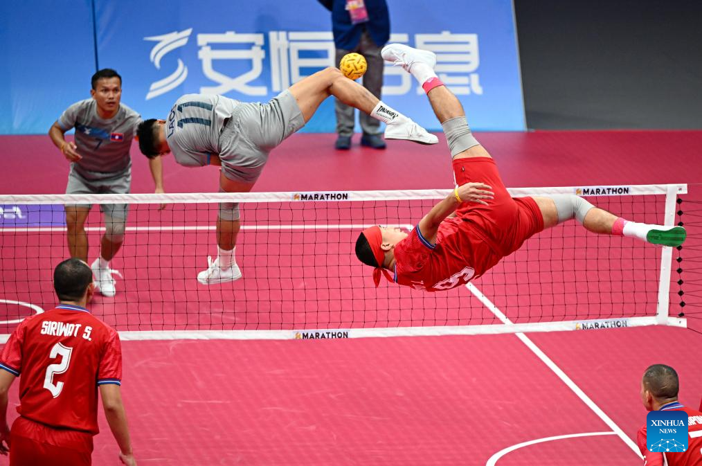 Team Thailand compete against Team Laos during Men's Team Regu Preliminary Match of Sepaktakraw at the 19th Asian Games in Jinhua, east China's Zhejiang Province, Sept. 24, 2023. (Xinhua/Chen Zhonghao)
