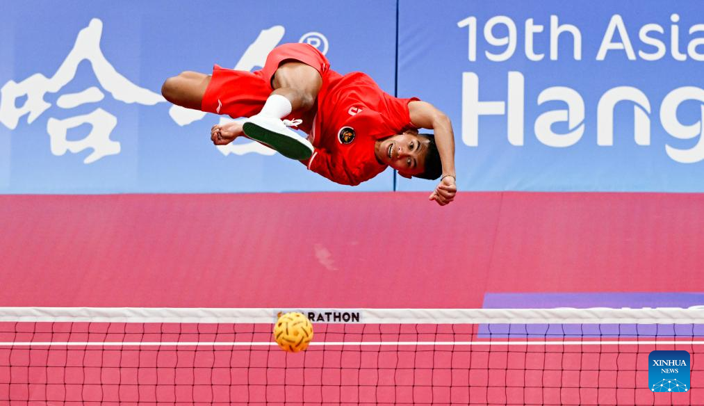 Jelki Ladada of Team Indonesia kicks the ball during Men's Team Regu Preliminary Match of Sepaktakraw between Indonesia and South Korea at the 19th Asian Games in Jinhua, east China's Zhejiang Province, Sept. 24, 2023. (Xinhua/Chen Zhonghao)