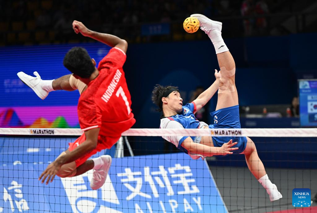 Im Ansoo of Team South Korea competes against Saiful Rijal of Team Indonesia during Men's Team Regu Preliminary Match of Sepaktakraw between Indonesia and South Korea at the 19th Asian Games in Jinhua, east China's Zhejiang Province, Sept. 24, 2023. (Xinhua/Chen Zhonghao)