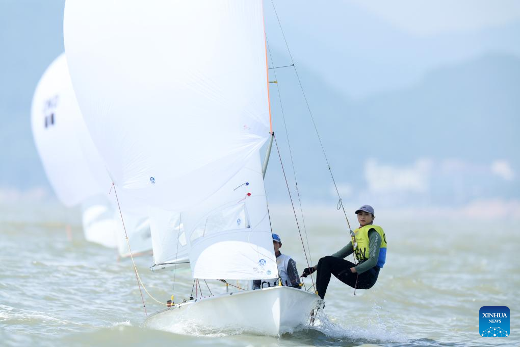 Wang Jingsa (R)/Dong Wenju of China compete during the Mixed Dinghy 470 Race of sailing at the 19th Asian Games in Ningbo, east China's Zhejiang Province, Sept. 24, 2023. (Xinhua/Zhang Tao)