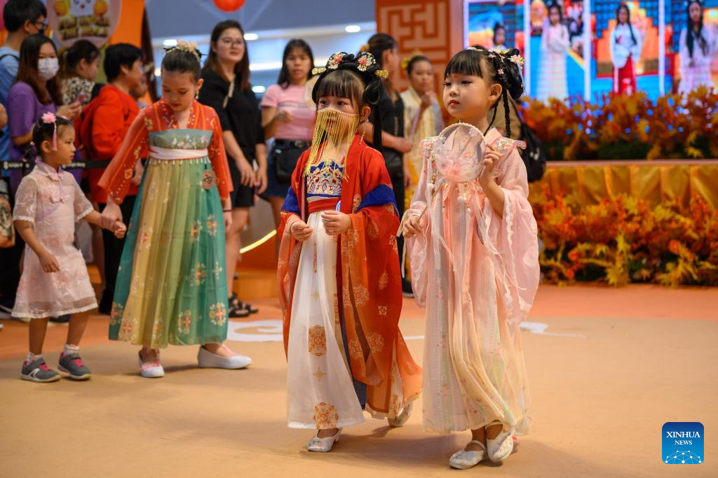 Children wearing Hanfu, an ancient clothing traditionally used to be worn by ethnic-majority Han Chinese, participate in an event to celebrate the upcoming Mid-Autumn Festival in Kuala Lumpur, Malaysia, Sept. 24, 2023. (Photo by Chong Voon Chung/Xinhua)