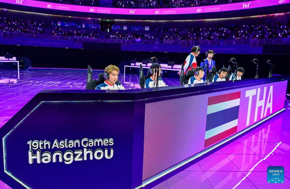 Team Thailand compete during the Arena of Valor Asian Games Version Group D match of Esports at the 19th Asian Games in Hangzhou, east China's Zhejiang Province, Sept. 24, 2023. (Xinhua/Yan Linyun)