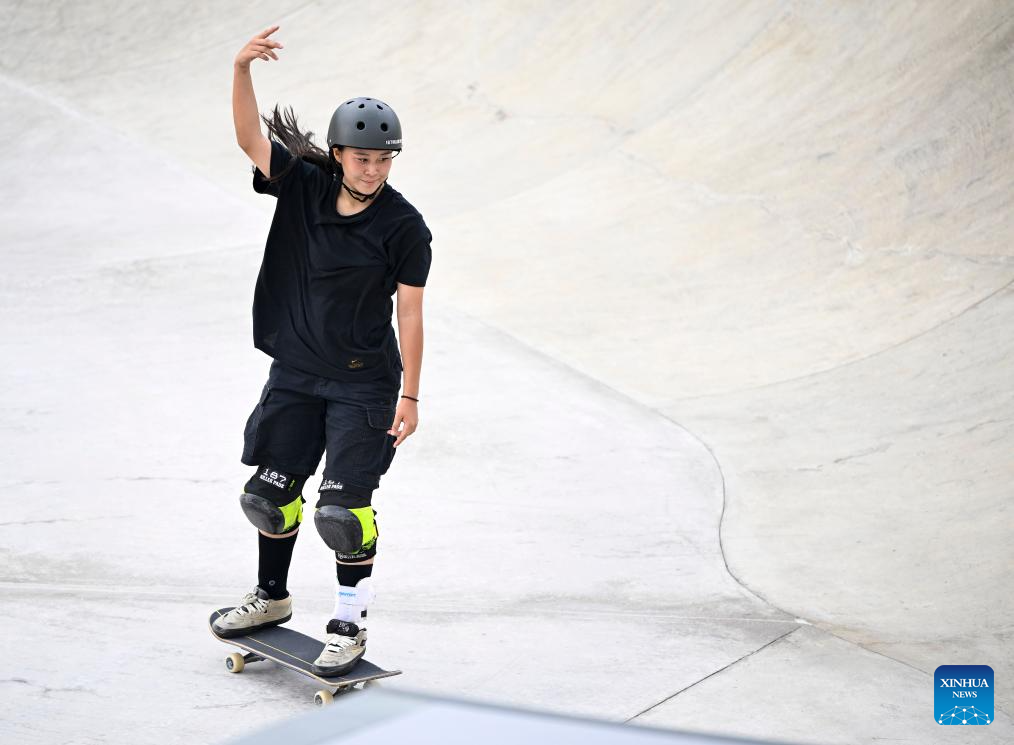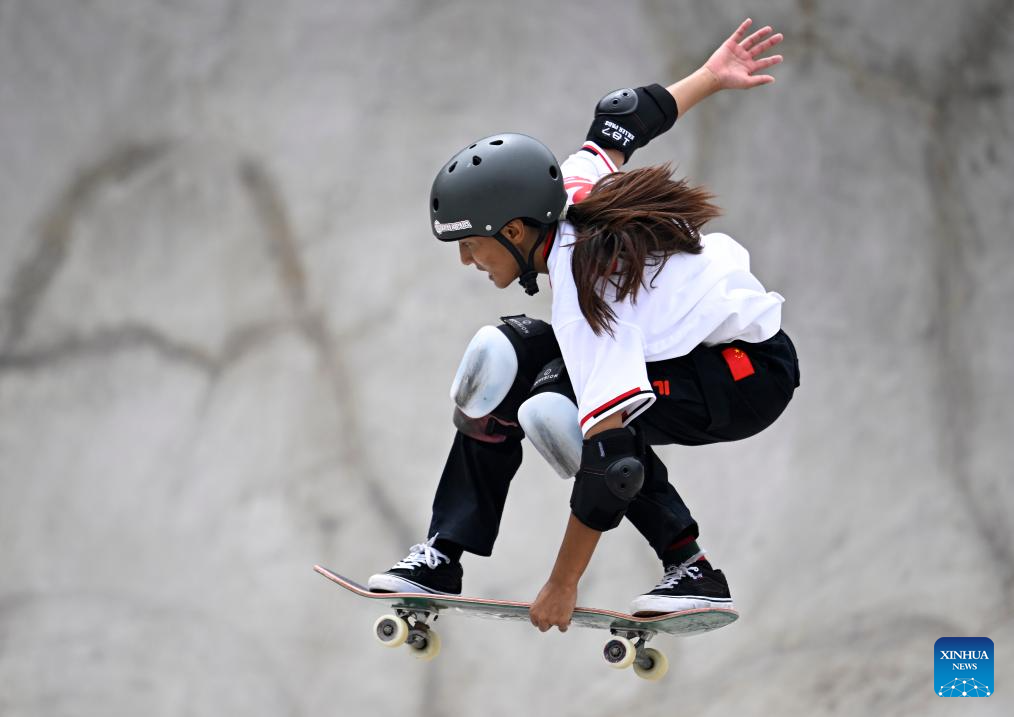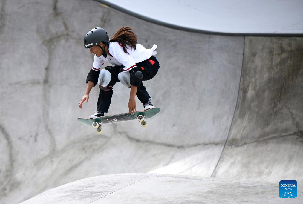 Kusaki Hinano of Japan competes during the Women's Park Final of Skateboarding at the 19th Asian Games in Hangzhou, east China's Zhejiang Province, Sept. 25, 2023. (Xinhua/Pan Yulong)