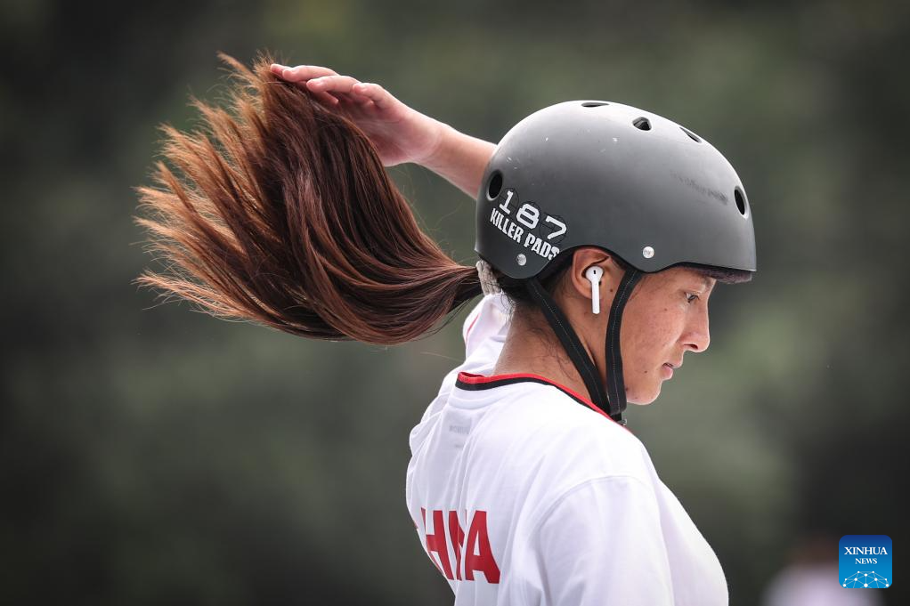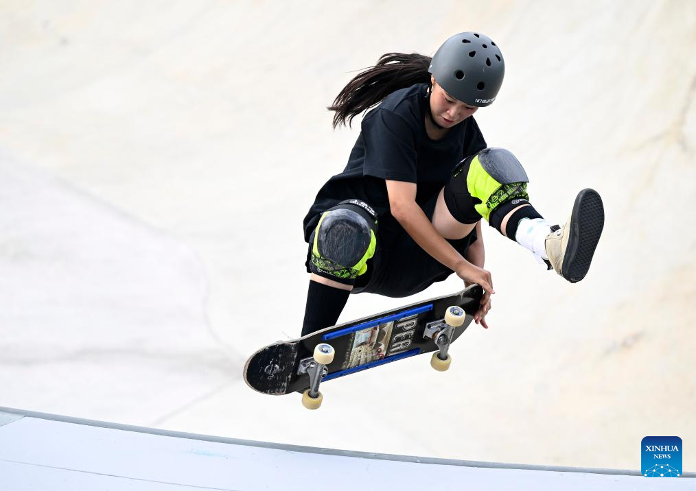 Mao Jiasi of China competes during the Women's Park Final of Skateboarding at the 19th Asian Games in Hangzhou, east China's Zhejiang Province, Sept. 25, 2023. (Xinhua/Pan Yulong)