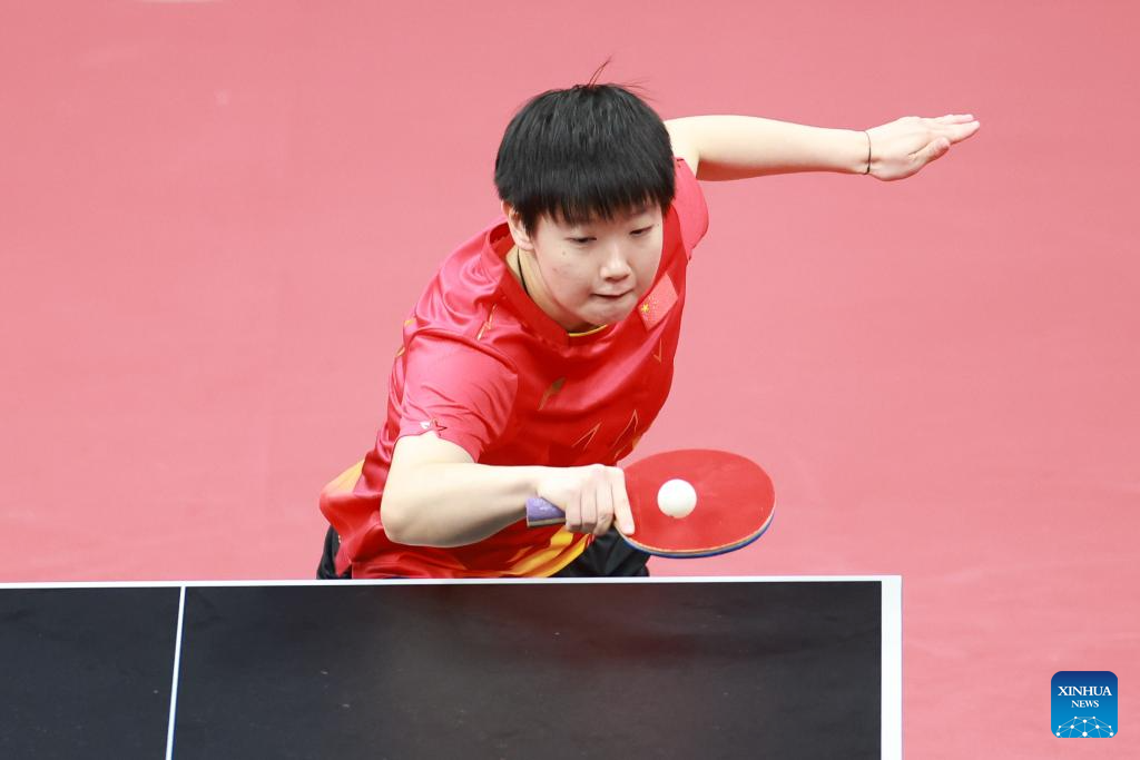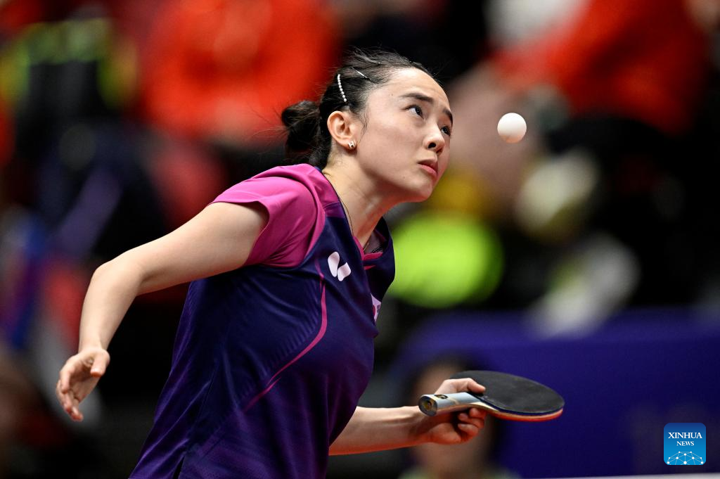 Wang Manyu of China competes during the Women's Team Semifinal Table tennis match between China and Thailand at the 19th Asian Games in Hangzhou, east China's Zhejiang Province, Sept. 25, 2023. (Xinhua/Liu Xu)
