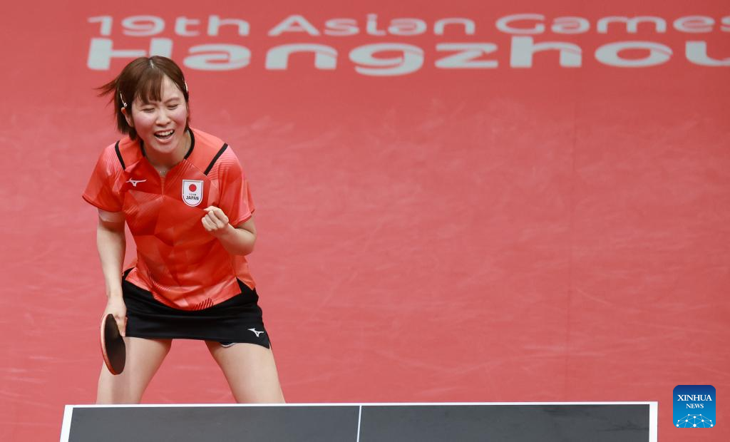 Hirano Miu of Japan reacts during the Women's Team Semifinal of Table Tennis between Japan and South Korea at the 19th Asian Games in Hangzhou, east China's Zhejiang Province, Sept. 25, 2023. (Xinhua/Liu Xu)
