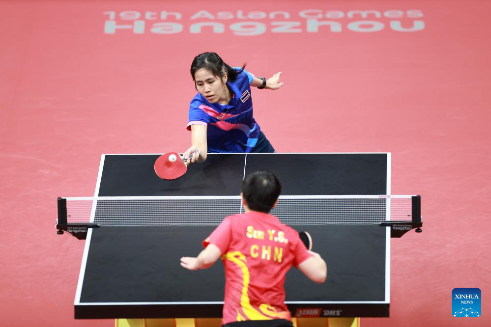 Suthasini Sawettabut (top) of Thailand competes during the Women's Team Semifinal Table tennis match between China and Thailand at the 19th Asian Games in Hangzhou, east China's Zhejiang Province, Sept. 25, 2023. (Xinhua/Liu Xu)