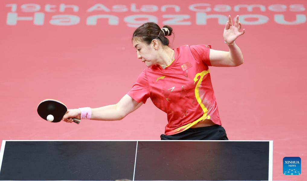 Chen Meng of China competes during the Women's Team Semifinal Table tennis match between China and Thailand at the 19th Asian Games in Hangzhou, east China's Zhejiang Province, Sept. 25, 2023. (Xinhua/Liu Xu)