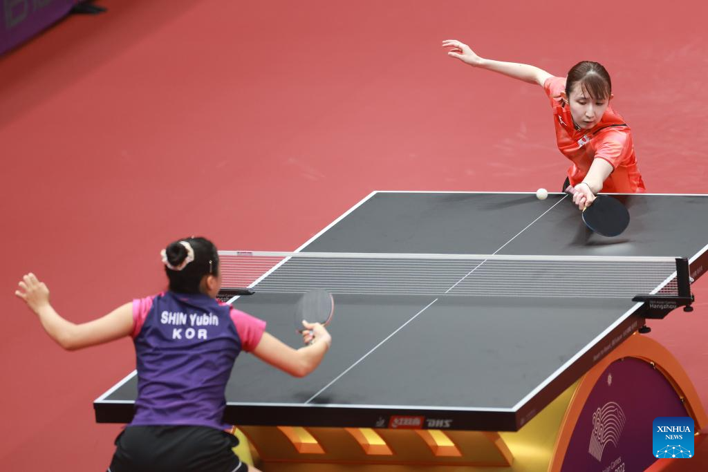 Hayata Hina (R) of Japan hits a return during the Women's Team Semifinal of Table Tennis between Japan and South Korea at the 19th Asian Games in Hangzhou, east China's Zhejiang Province, Sept. 25, 2023. (Xinhua/Liu Xu)