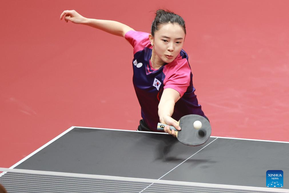 Jeon Jihee of South Korea hits a return during the Women's Team Semifinal of Table Tennis between Japan and South Korea at the 19th Asian Games in Hangzhou, east China's Zhejiang Province, Sept. 25, 2023. (Xinhua/Liu Xu)