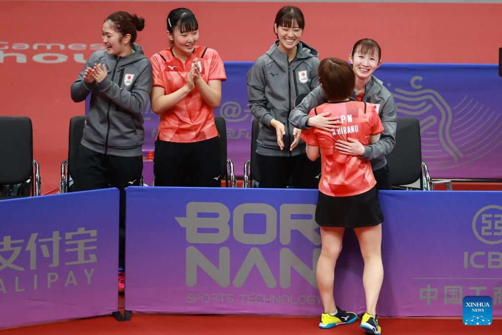 Athletes of Japan celebrate after the Women's Team Semifinal of Table Tennis between Japan and South Korea at the 19th Asian Games in Hangzhou, east China's Zhejiang Province, Sept. 25, 2023. (Xinhua/Liu Xu)