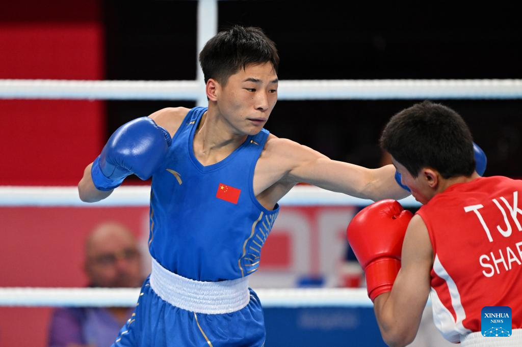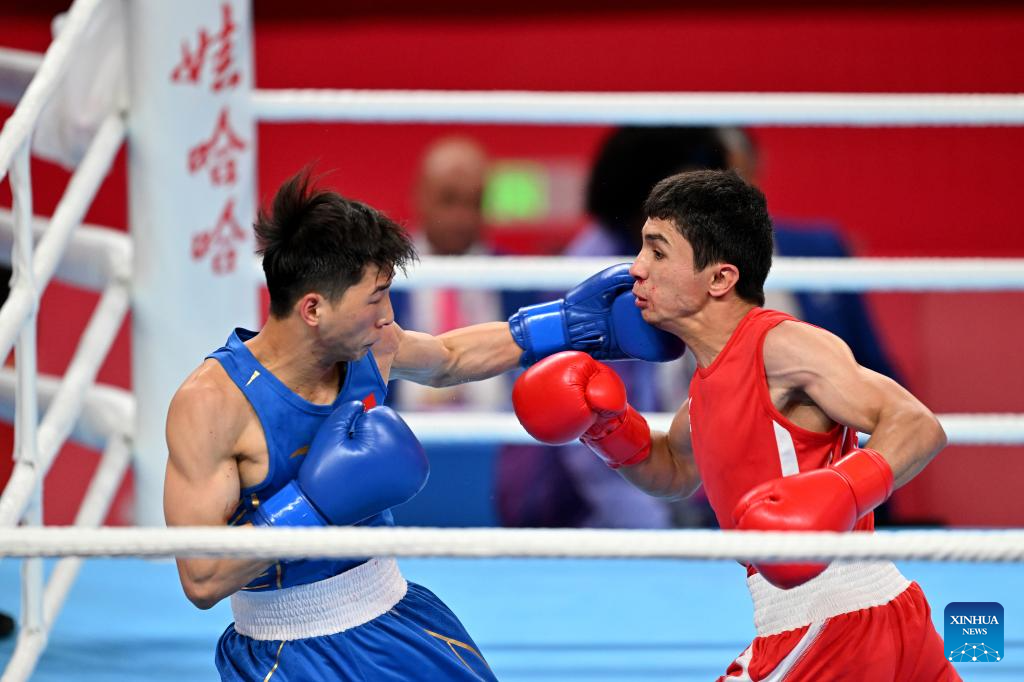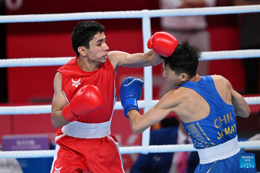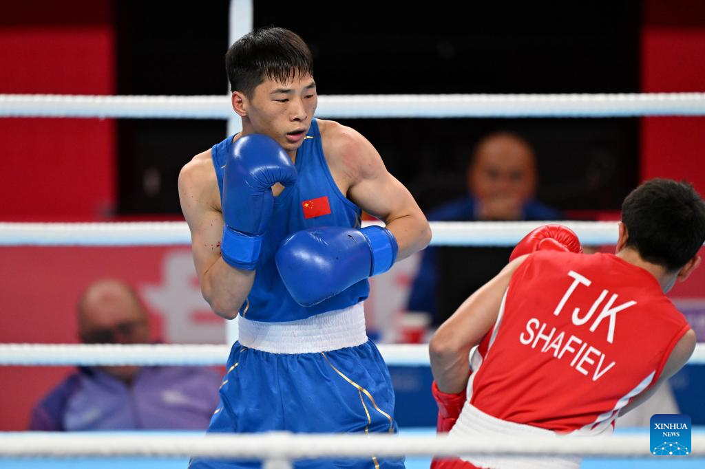 Zhang Jiamao (R) of China and Mehron Shafiev of Tajikistan compete during Boxing Men's 46-51kg Preliminaries round of 32 at the 19th Asian Games in Hangzhou, east China's Zhejiang Province, Sept. 25, 2023. (Xinhua/Zhan Yan)