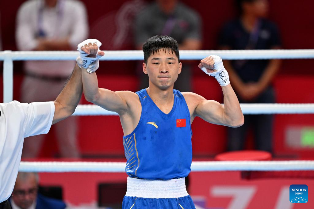Zhang Jiamao of China celebrates after Boxing Men's 46-51kg Preliminaries round of 32 at the 19th Asian Games in Hangzhou, east China's Zhejiang Province, Sept. 25, 2023. (Xinhua/Zhan Yan)