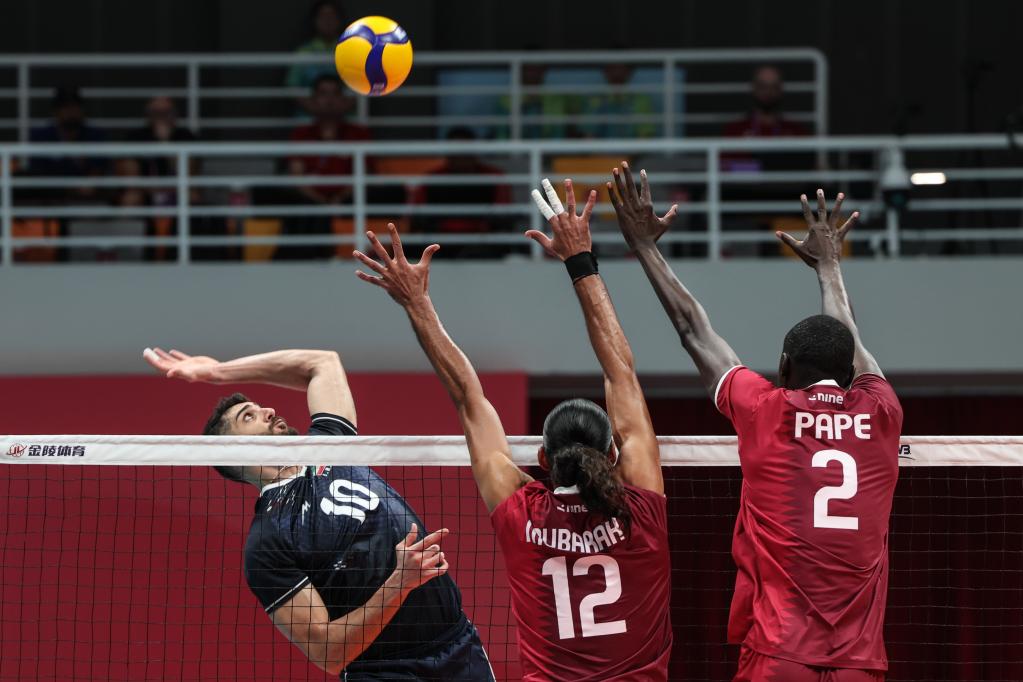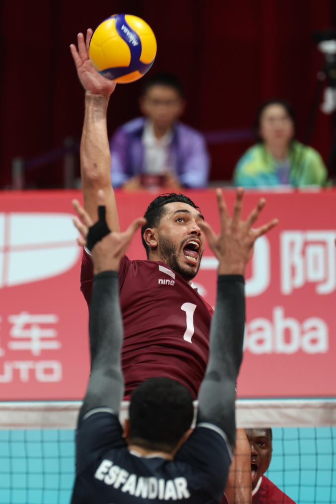 Youssef Oughlaf (C) of Qatar spikes the ball during the Volleyball Men's Semifinal between Iran and Qatar at the 19th Asian Games in Hangzhou, east China's Zhejiang Province, Sept. 25, 2023. (Xinhua/Zhu Zheng)
