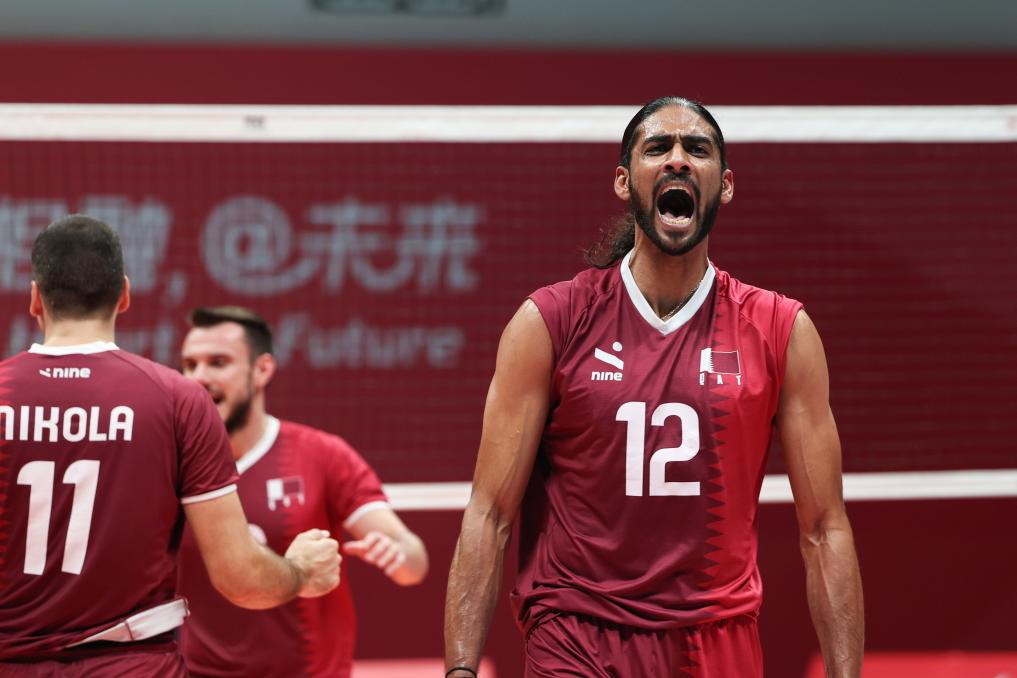 Mubarak Hammad (R) of Qatar celebrates during the Volleyball Men's Semifinal between Iran and Qatar at the 19th Asian Games in Hangzhou, east China's Zhejiang Province, Sept. 25, 2023. (Xinhua/Zhu Zheng)