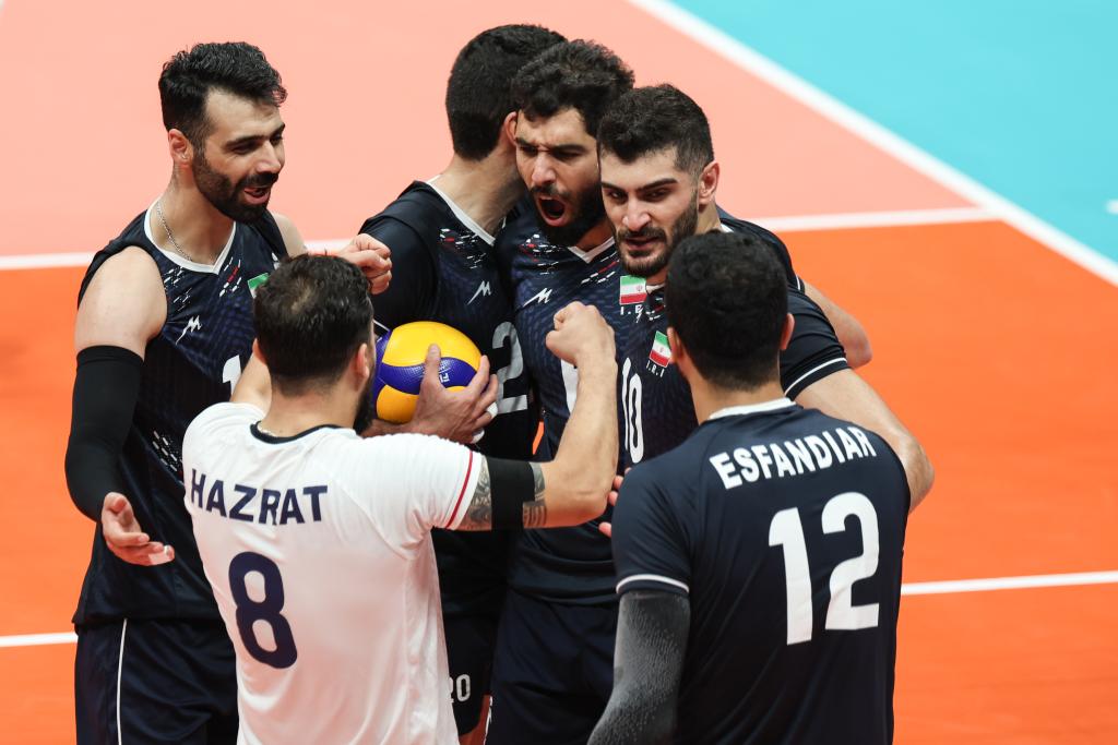 Players of team Iran celebrate after the Volleyball Men's Semifinal between Iran and Qatar at the 19th Asian Games in Hangzhou, east China's Zhejiang Province, Sept. 25, 2023. (Xinhua/Zhu Zheng)
