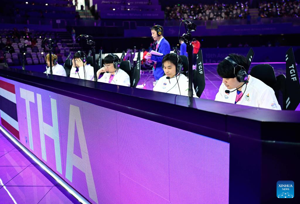 Team Thailand prepare to compete before Arena of Valor Asian Games Version Semifinal of Esports at the 19th Asian Games in Hangzhou, east China's Zhejiang Province, Sept. 25, 2023. (Xinhua/Yan Linyun)