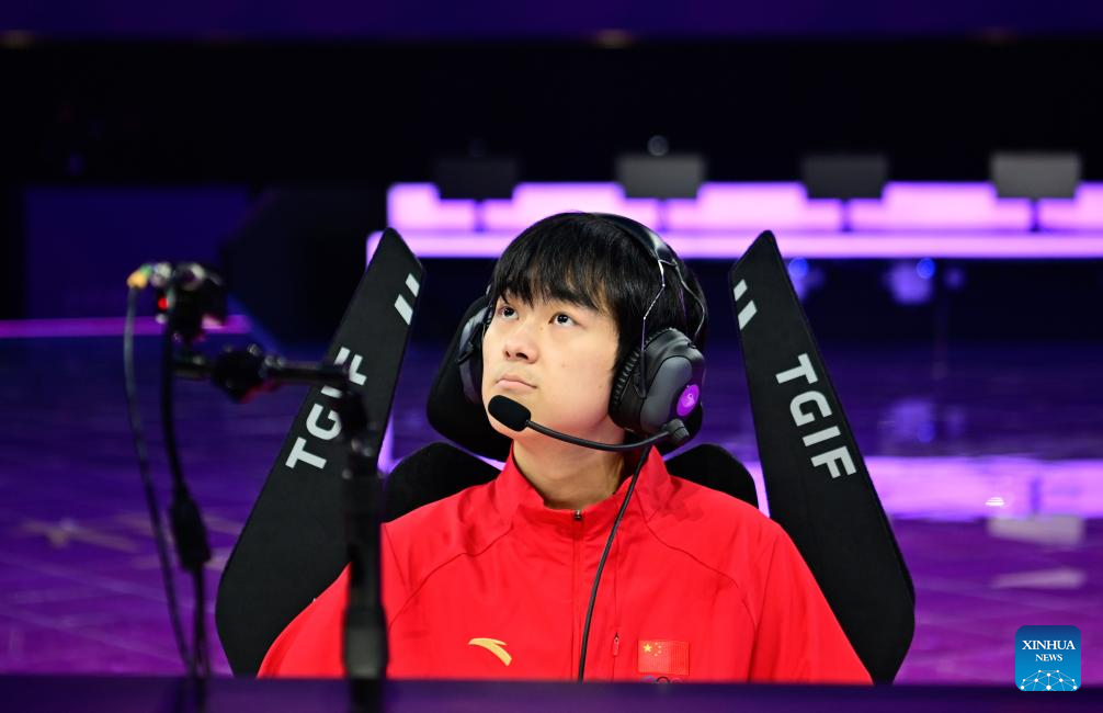 Jiang Tao of China reacts before Arena of Valor Asian Games Version Semifinal of Esports at the 19th Asian Games in Hangzhou, east China's Zhejiang Province, Sept. 25, 2023. (Xinhua/Yan Linyun)